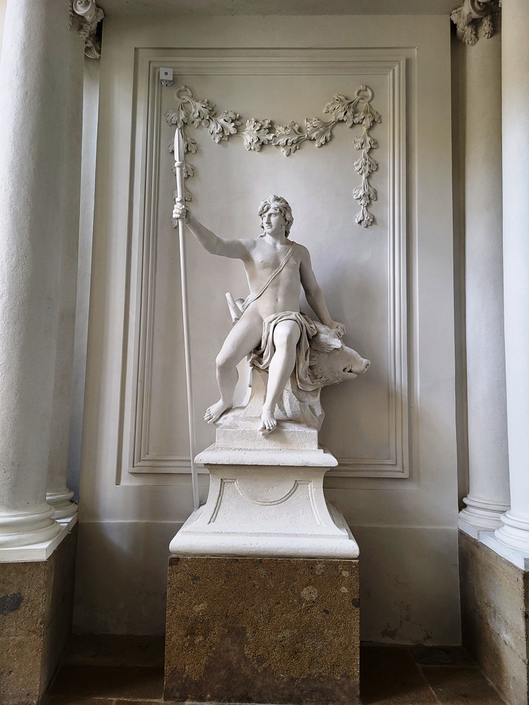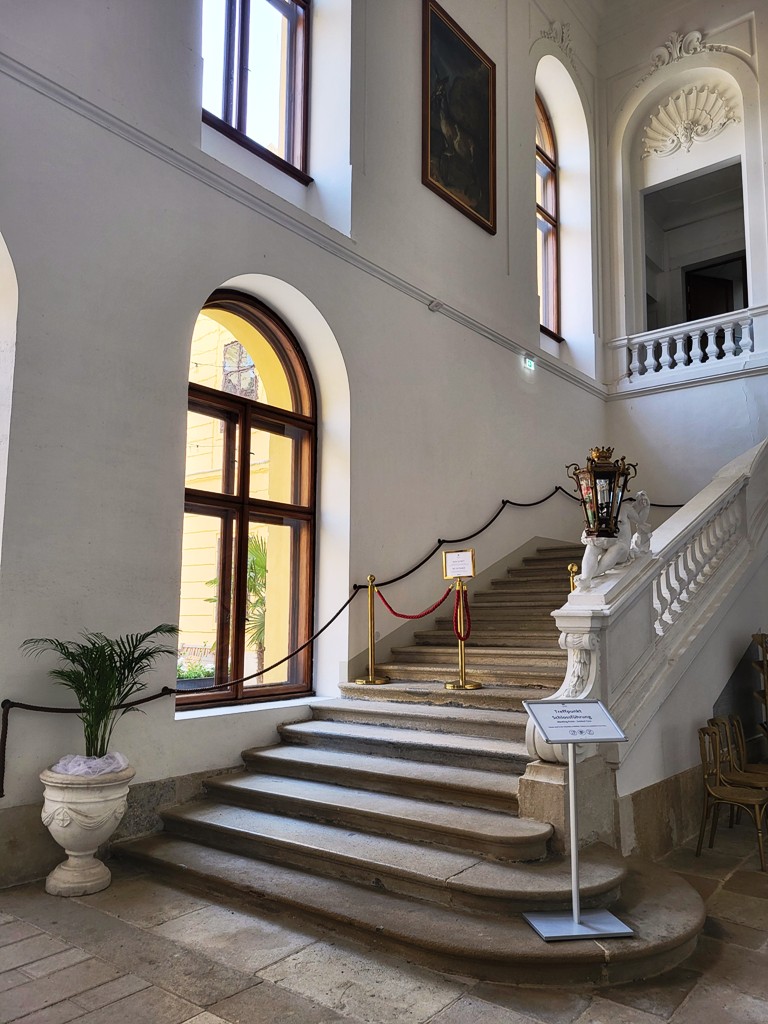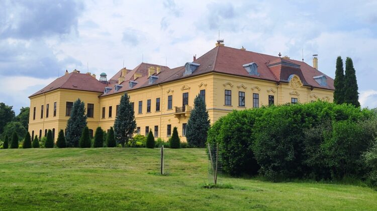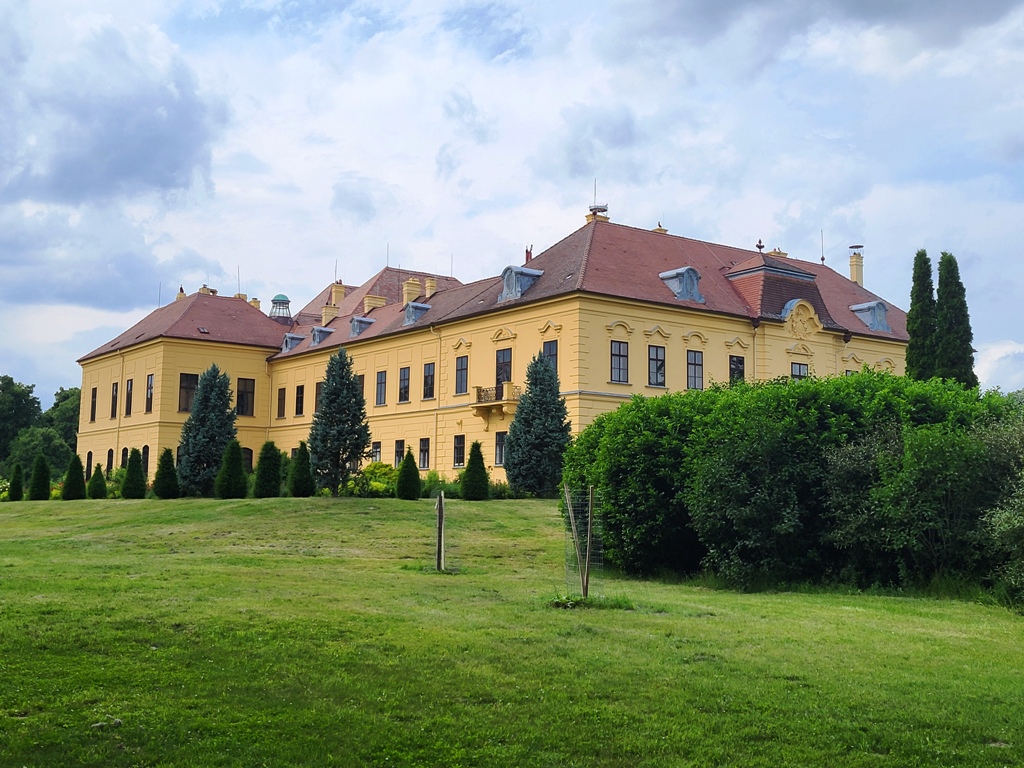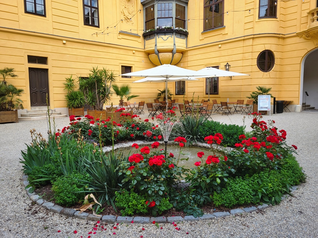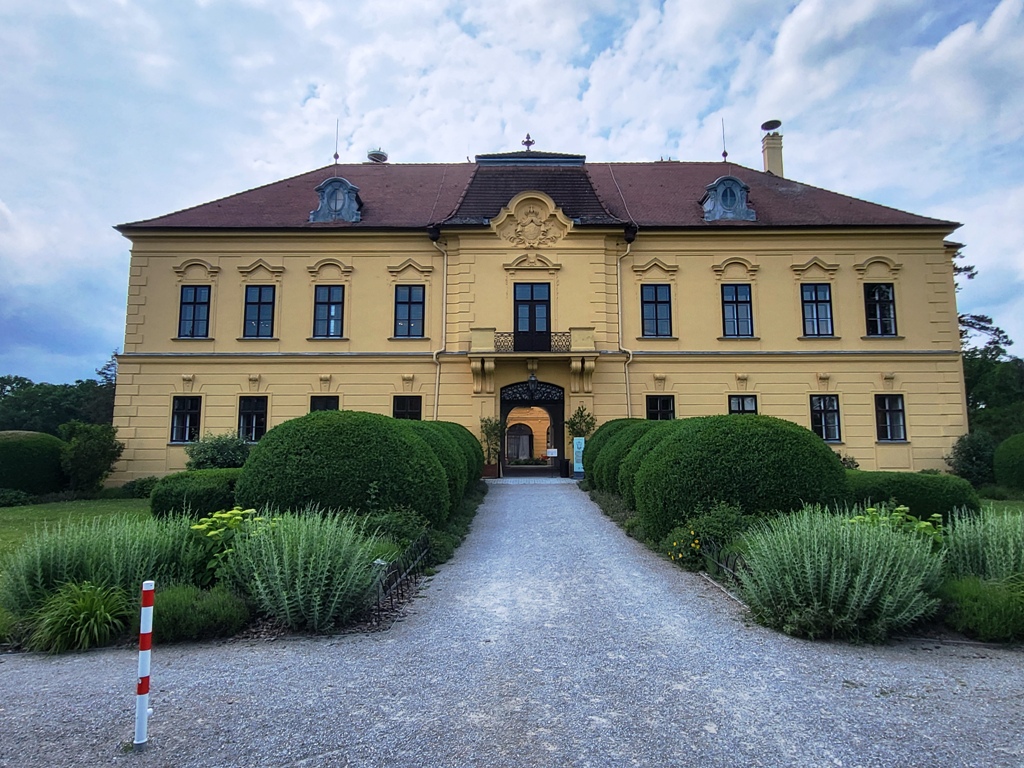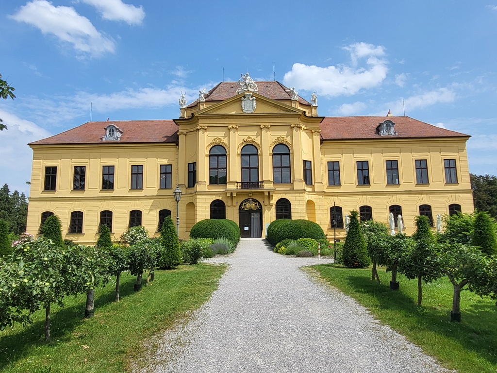 A kastély a Donau Auen Nemzeti Park érintetlen természeti környezetébe simulva, 27 hektáros tájkert közepén magasodik. Sárga falaival azonnal szembetűnik, most sem hagytuk ki, hogy legalább átsétáljunk rajta, néhány pillanatot időzve az udvar közepét díszítő virágokkal körbevett kis szökőkút mellett.