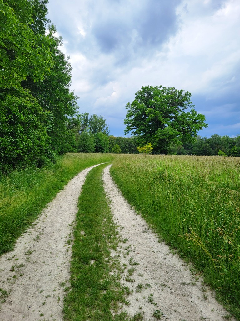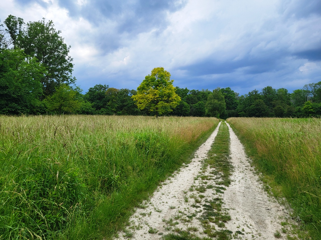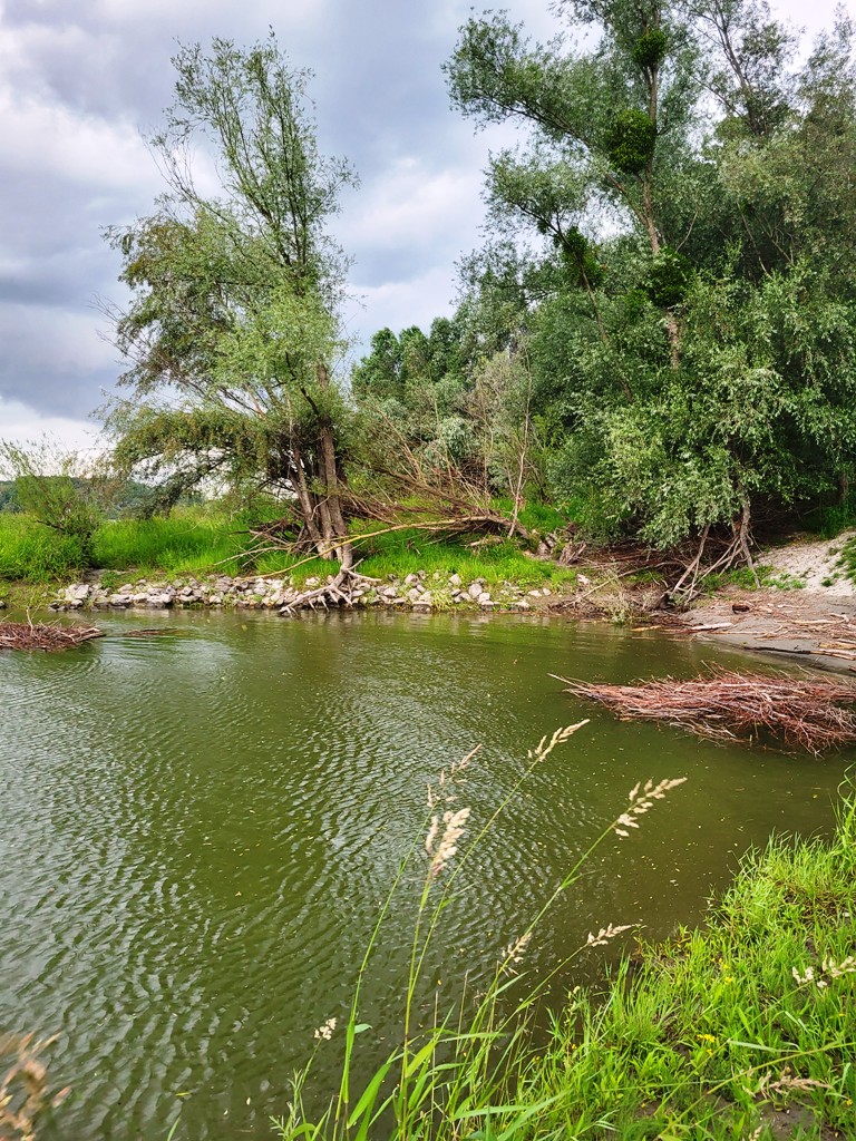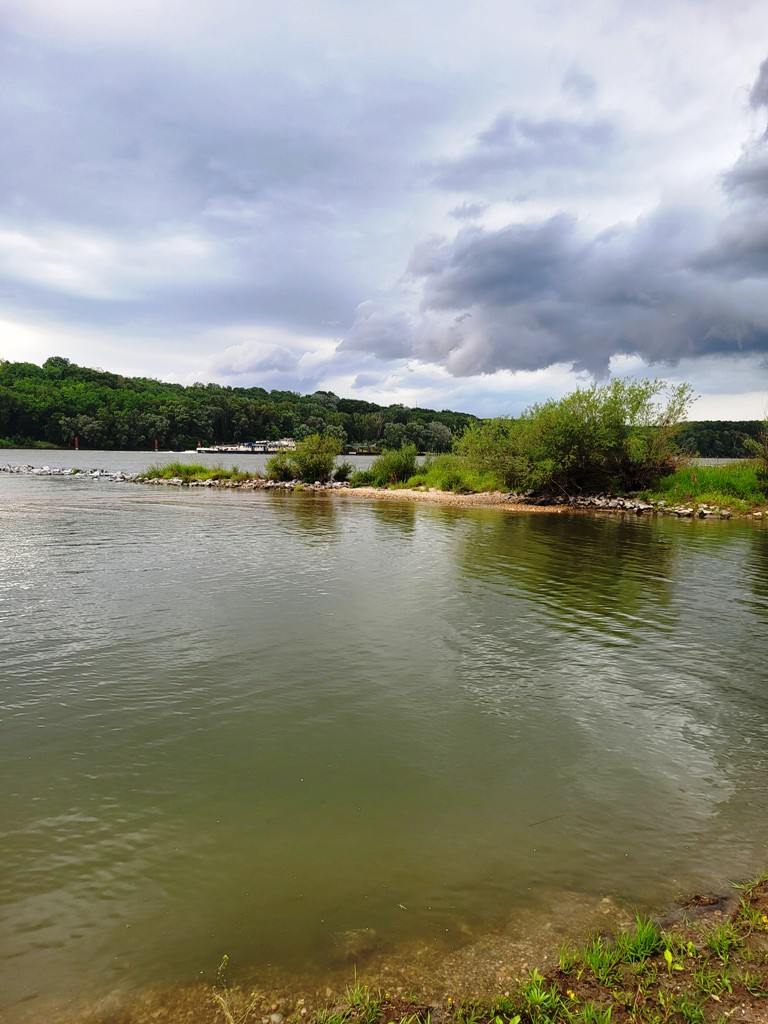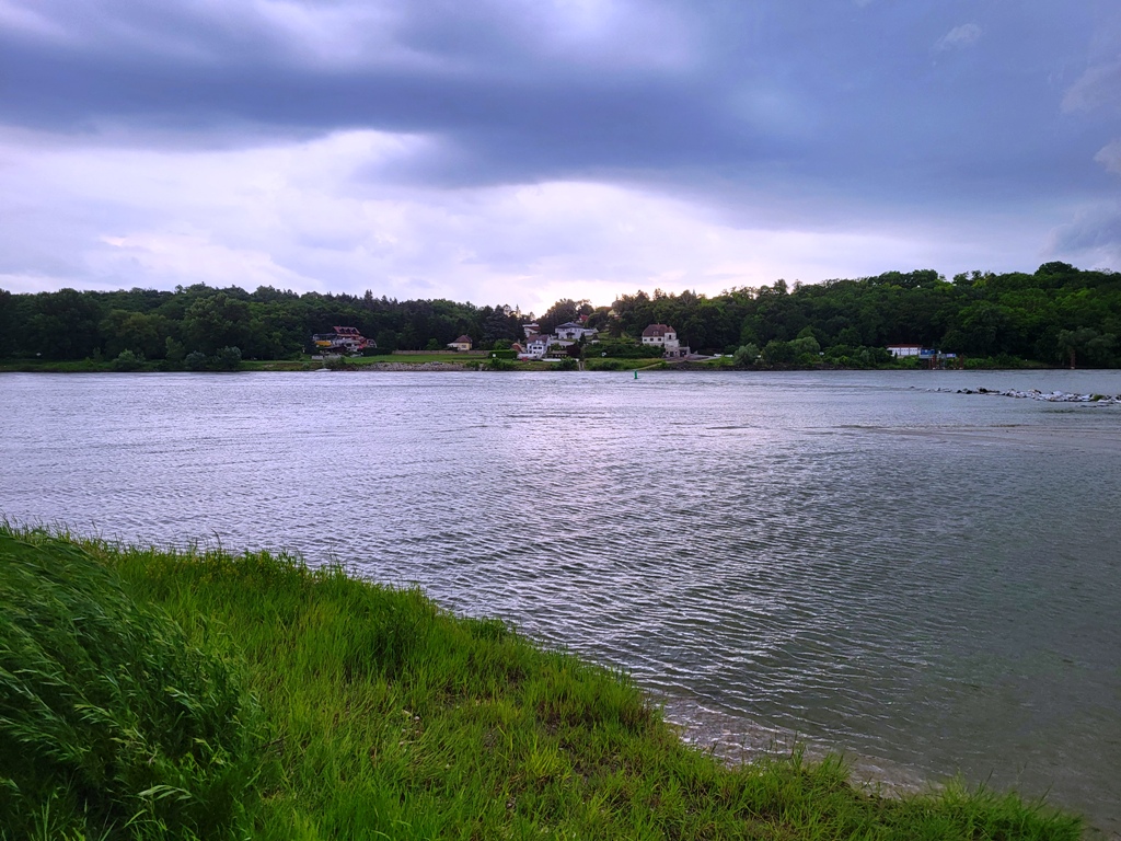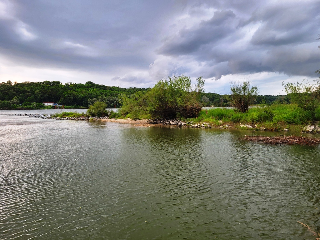 Más kirándulókkal is találkoztunk, kereszteztük a kerékpárutat, ahol számos bringást láttunk, végül négylábú társunkat is beleszámítva, csak mi négyen csörtettünk a folyó felé. Mire a parthoz értünk, súlyos fellegek gyűltek fölénk és feltámadt a szél. Egy-két fényképet azért hamar ott is készítettünk, majd a lehető leggyorsabb iramban visszafelé indultunk. Időközben eleredt az eső, egy darabig azonban ez még nem okozott gondot.