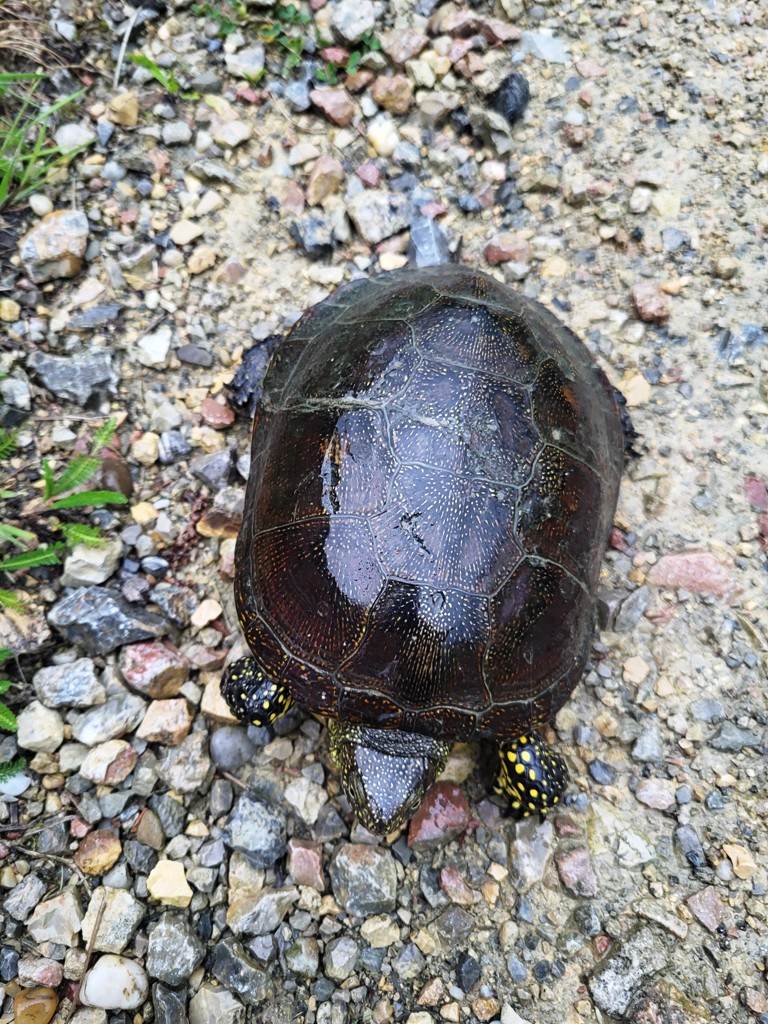 Egyre jobban esett, hirtelen egy kis mocsári teknős jött velünk szembe az úton. Muszáj volt megállni néhány fotó és rövid videó kedvéért. A cudar idő ellenére mosolyra húzódott a szánk, aztán fokozott iramban siettünk tovább.