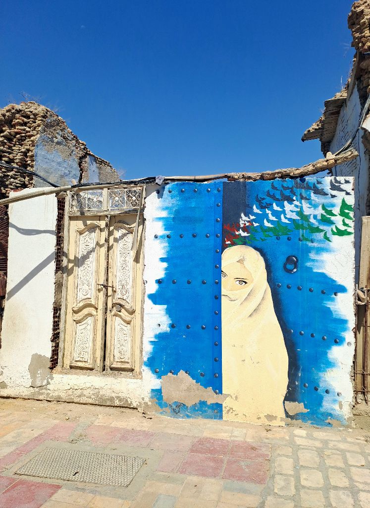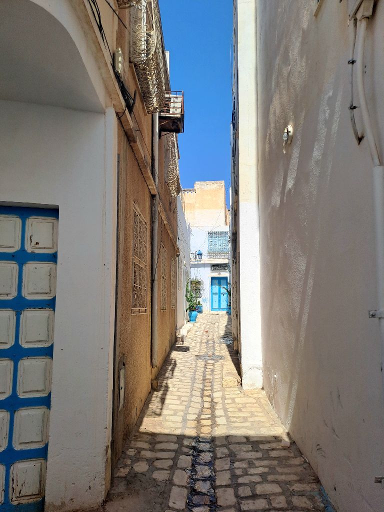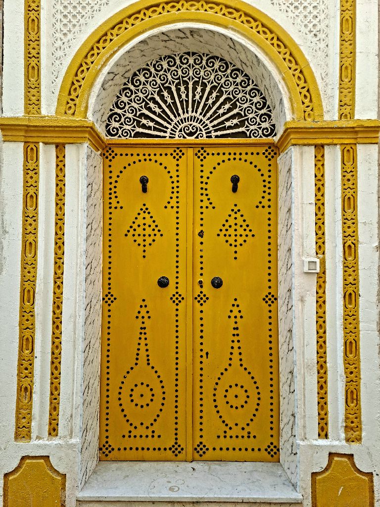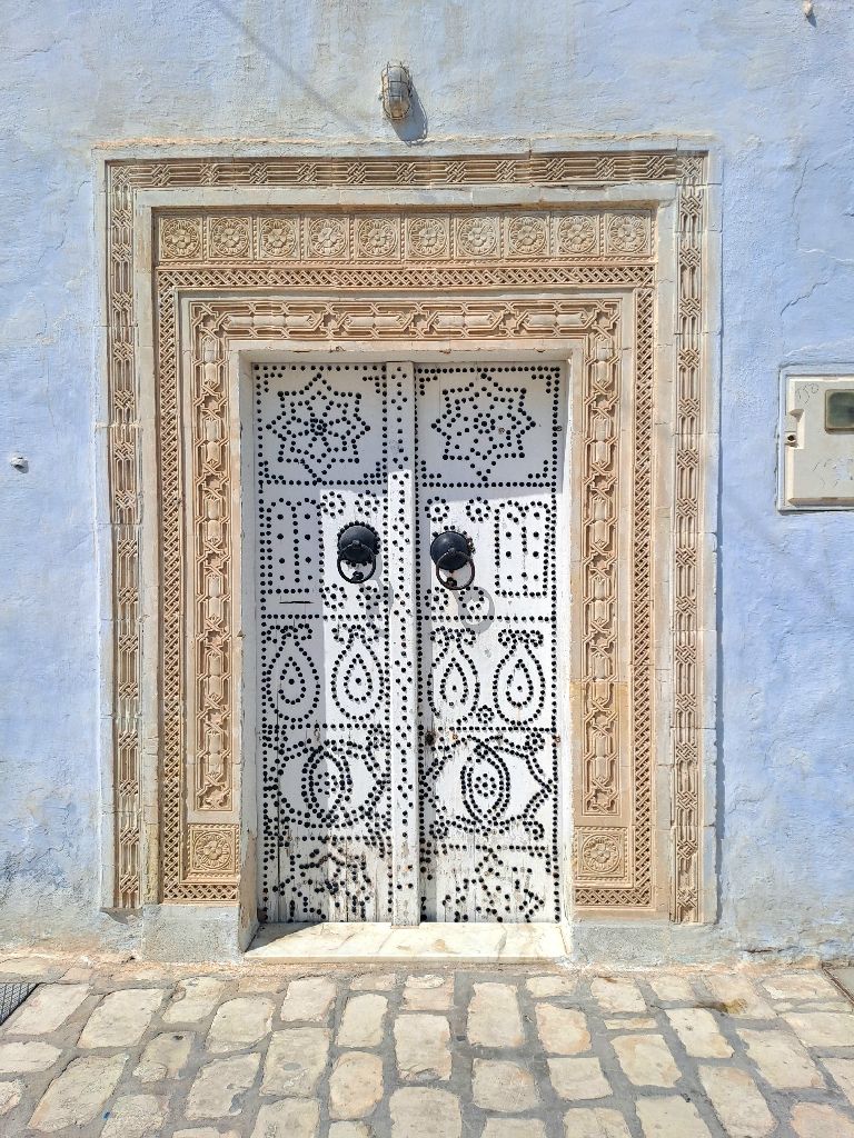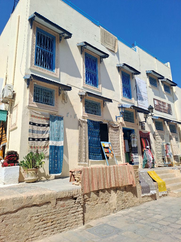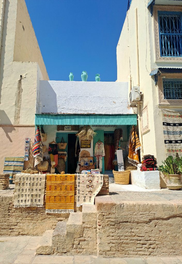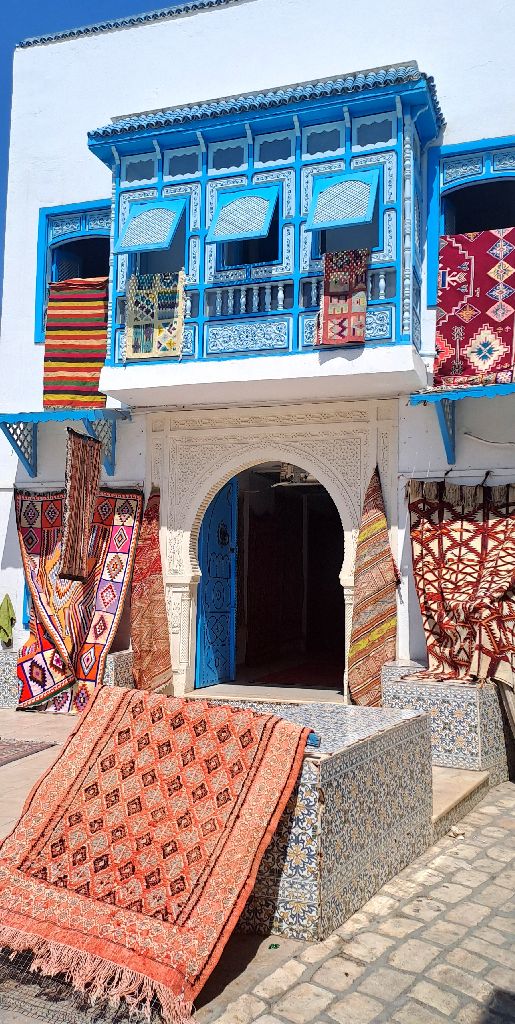 Kairouan medinája az egyik legszebb része a városnak. Órákig sétáltunk a szűk, kanyargós, macskaköves utcákon megcsodálva a gyönyörű mintázott ajtókat. Mangólevet iszunk, a kókuszlé mellett a másik kedvencem Tunéziában. Tarek elvitt egy műhelybe, ahol megnéztük, hogy szövik kézzel a szőnyeget, hogy hímzik a kendőket. Legszívesebben mindet megvenném, annyira gyönyörűek. A kairouani szőnyeg országos hírű, sőt Tunézián túl is ismert. Tiszta gyapjú és leggyakoribb motívuma az ún. klasszikus kairouani, amely mintáinak egy részét a Nagymecset dekorációjától kölcsönzi. A szőnyegek kézi szövéssel készülnek, áruk a négyzetéterre eső csomók számától függ.